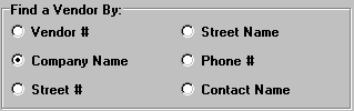 You may have too many vendors to simply scroll through to find the one you want. In that case, there are six other different ways to find a vendor. Left-click the radio button corresponding to the search criteria you want to use: