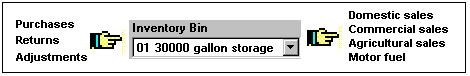 Let's say you want to keep track of the propane in your main storage tank. First, you would set up an Inventory Bin for it. Then, additions to this Bin are automatically made by bulk purchases of propane paid for through Accounts Payable. Reductions to this Bin are automatically made by sales of multiple propane products (such as domestic, commercial, agricultural, motor fuel, etc) through Accounts Receivable.