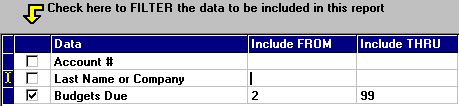 7. Check the "Budgets Due" filter and enter "2" and "99" in the FROM and TO boxes. This will select only those accounts that have more than one budget payment due. It should look like this: