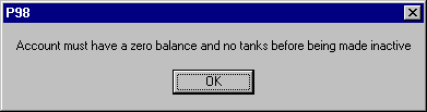 9. If you are trying to make an account inactive that does NOT have tanks assigned to it and DOES have a zero balance, no message will appear and the account will immediately be "inactive".