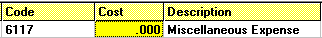 9. This will enter the General Ledger account number in the Code field and the appropriate description in the Description field. The cursor will automatically be positioned in the Cost field, like this: